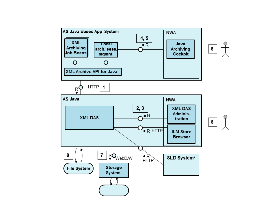 - Interface 7: If you decide to store your resources in a file system that is accessible from the AS Java, you can do so by specifying the directory using the XML DAS administration (function Define Archive Stores).