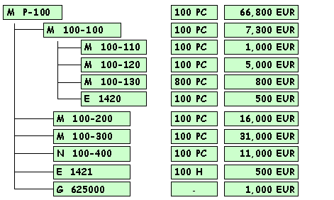 The costs of the assemblies are calculated level by level. This means that the costs for assemblies 100-100, 100-200, 100-300 and so on are first calculated, and then included in the total costs for assembly P-100. The process of assigning the costs of the subordinate material components and assemblies to each of the higher production levels is called cost rollup .
