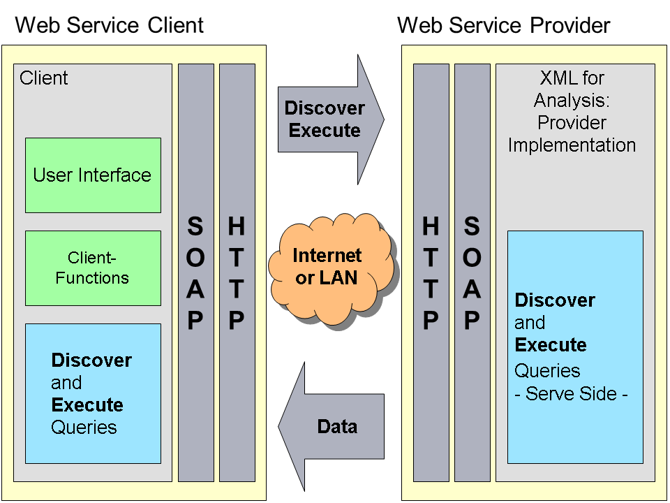 The following graphic illustrates (based on the XMLA specification from Microsoft) a possible implementation of an XMLA Web service:
