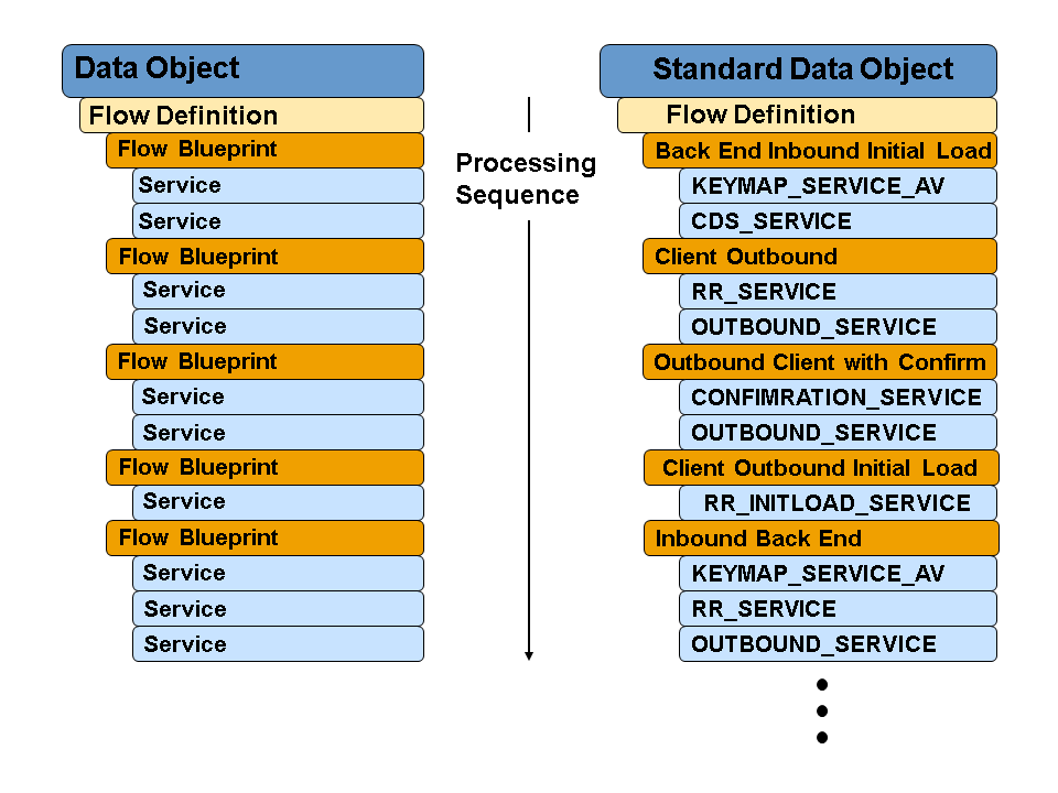 A flow definition is made up of flow blueprints. A flow blueprint specifies the services to be called to process a data object. Each flow blueprint defines a logically irreducible processing scenario such as:
