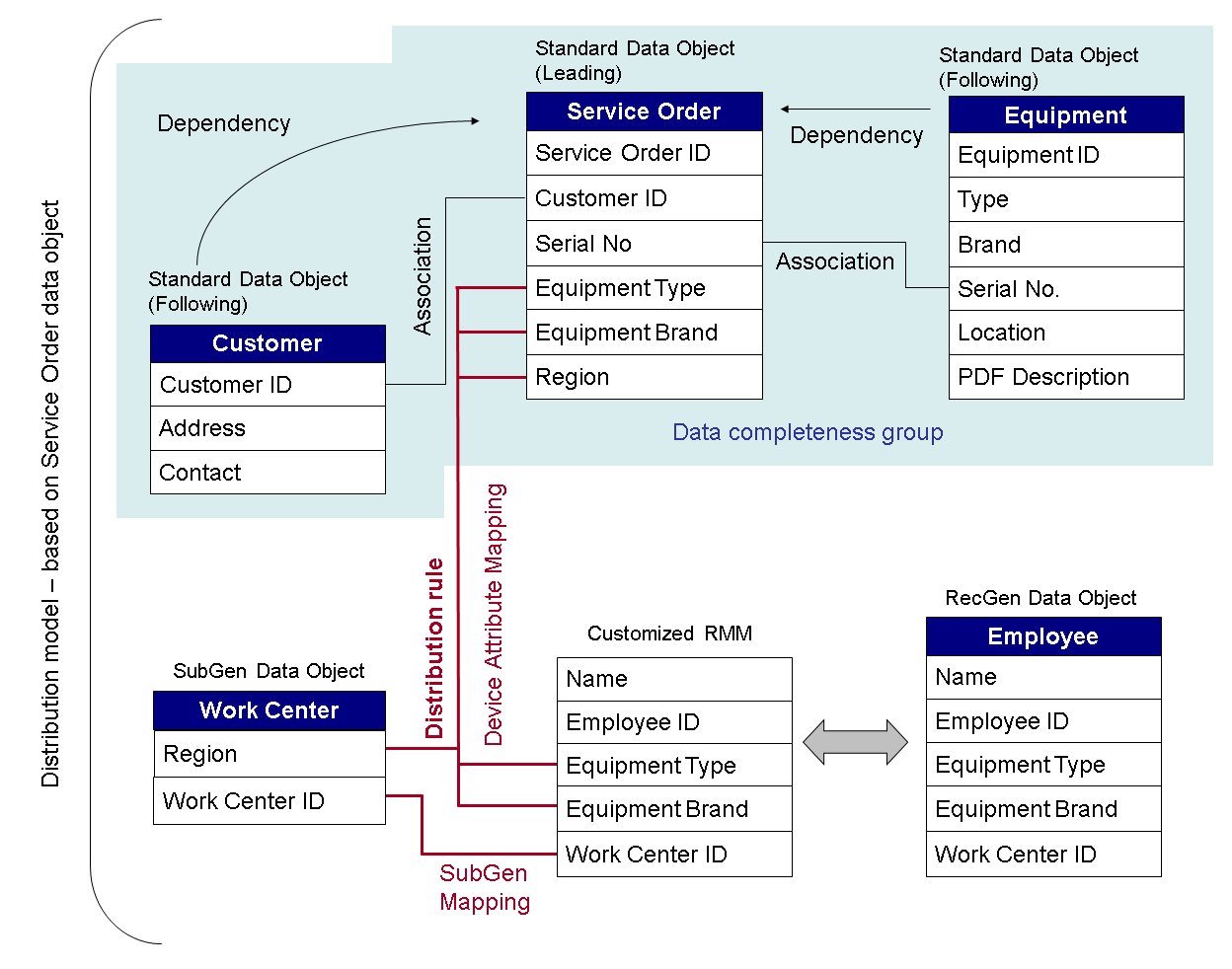 The following figure illustrates the associations, dependencies, distribution rules, and data completeness group for this tutorial: