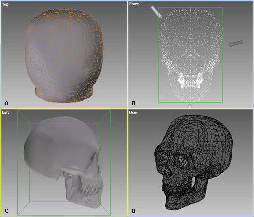 A: Top view, Solid Wireframe mode, B: Front view, Vertices mode, scene bounding box, cameras and lights elements, C: Left view, Solid mode, scene bounding box element, D: User-defined view, Line Illustration mode