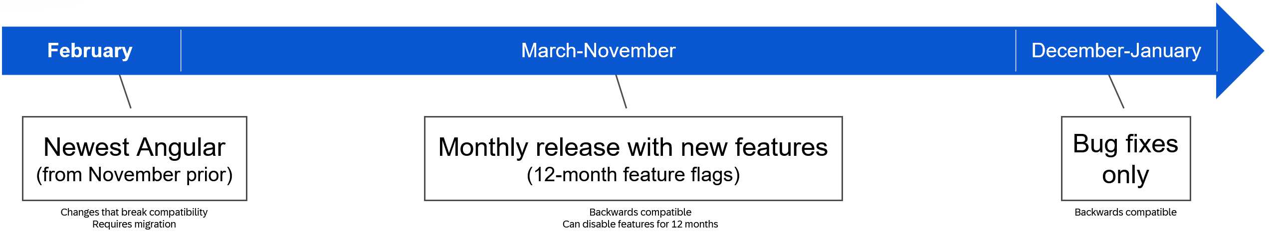 Composable storefront uses the Angular framework, which publishes new major versions twice a year. These major versions of Angular have 18-month long-term support windows. In the past, composable storefront was updated twice a year with the new Angular framework. This is changing, as follows: