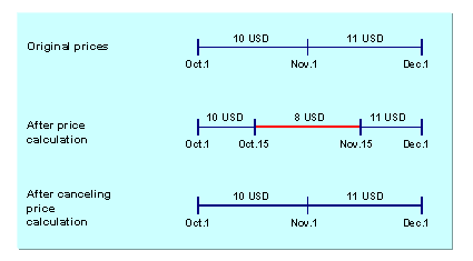 If another price change has already overridden the change you want to cancel, you can no longer reverse your change. As in the example above, a condition record valid from October 1 to November 1 can no longer be canceled if - as in step 2 - a sales price calculation valid from October 15 to November 15 has been carried out.