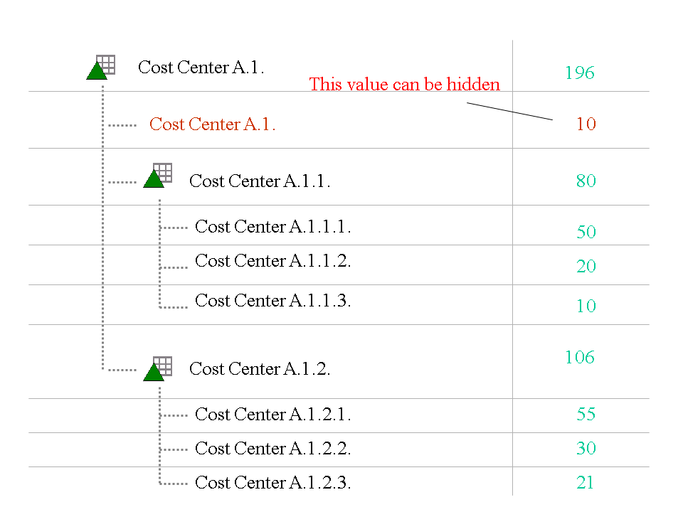 In hierarchies, nodes always display the aggregated values of the lower-level nodes and leaves. If a node has a posted value, it is not obvious to the user. To display this posted value, an additional leaf is inserted that has the same name as the node. This leaf displays the value posted to the node.