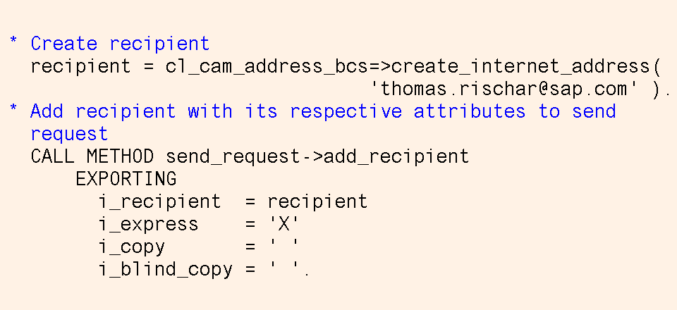 To enable an object to be sent using BCS, a sender and one or more recipients must be passed to BCS. This means that an instance of a class has to be created, which implements the interface IF_SENDER_BCS for the sender and the interface IF_RECIPIENT for the recipient. You then pass this instance to BCS with the method SET_SENDER or SET_RECIPIENT of the class CL_BCS. If you want to pass several recipients, you have to call the method SET_RECIPIENT for each recipient.