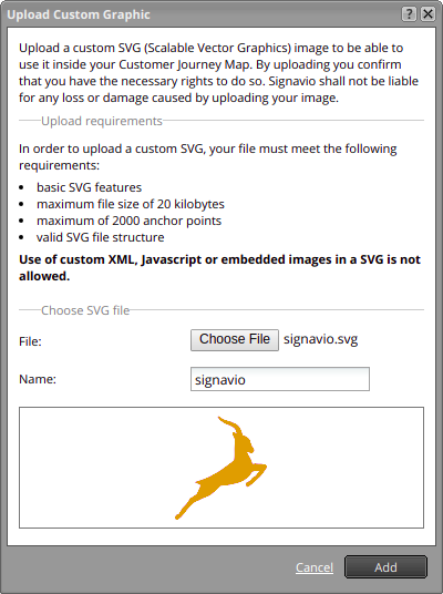 In the Custom attributes section, select the Custom Graphics tab. Select the Add button. The Upload Custom Graphic dialog opens, with details about the upload requirements for SVG files.