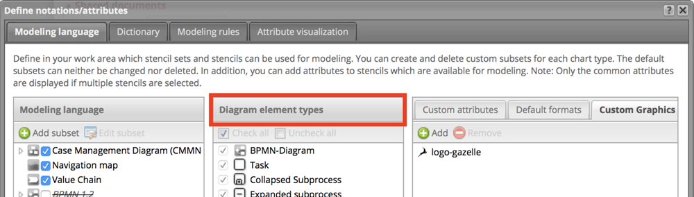 In the Diagram element types section, select the element type you want to set the custom graphic for. Note that not all elements can be customized.