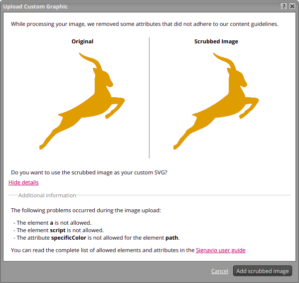SVG is a flexible, powerful file format. However, this flexibility makes it vulnerable to security exploits. To prevent possible security problems, SAP Signavio Process Manager will check each SVG file you try to upload and scrub anything potentially malicious from the file. It will then show you a preview dialog, so you can see the differences between the original and scrubbed file. If the scrubbed file is acceptable to you, you can then continue with the upload.