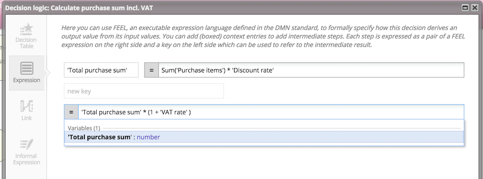 You can also use literal expressions instead of decision tables. Split a decision into two connected elements: one with a decision table and one with literal expression logic.
