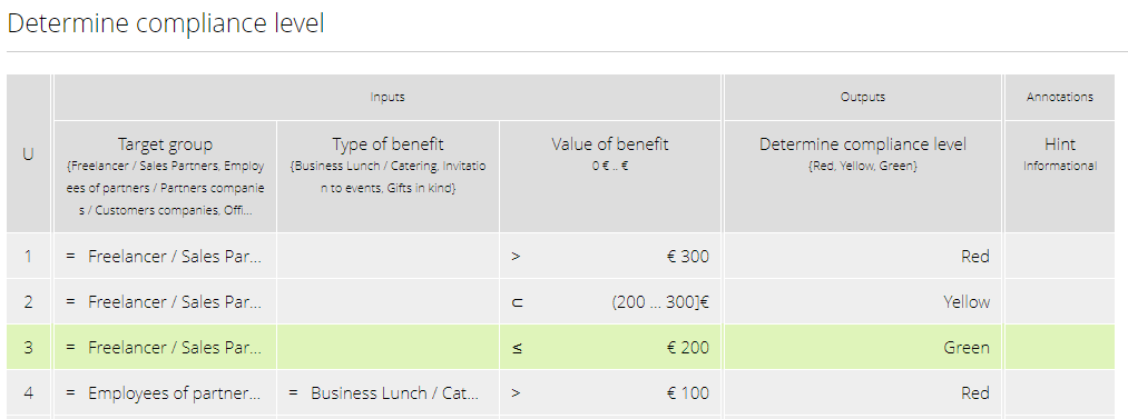 The progress bars in the decision elements indicates the extent to which data inputs are defined so far. When scrolling down, you can see a decision table overview that highlights the rules that apply in the current scenario: