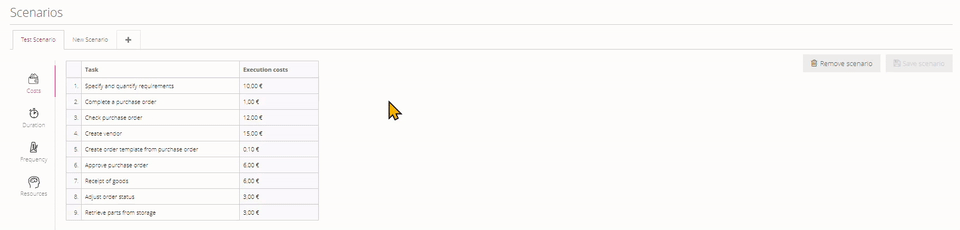 With scenarios you can manage different data sets for simulating one process. You can edit the scenario data by clicking on the corresponding tabs.