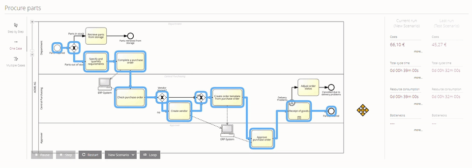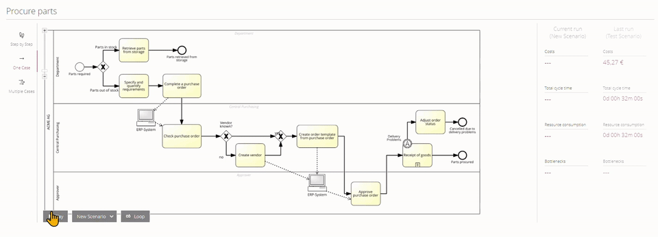 With the one-case simulation function you can simulate one specific case and analyze costs and the time consumption for that case.