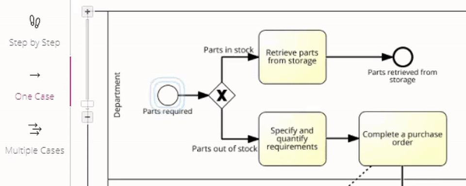 Read how to use the one-case simulation function in SAP Signavio Process Manager. With the One-case simulation function you can simulate one specific case and analyze costs and the time consumption for that case.