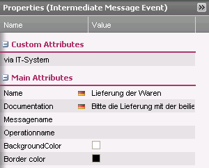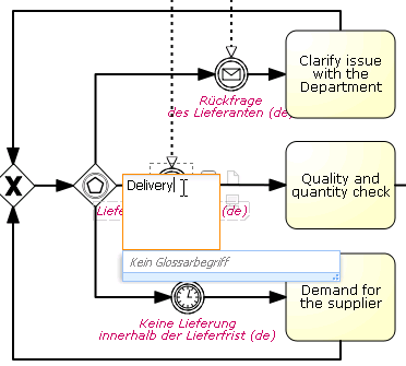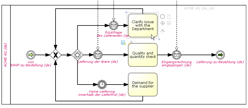 Diagram elements that are not yet translated are highlighted in red--in this example, the incoming message event 'Lieferung der Ware' is only available in German (thus, the "de" in brackets).