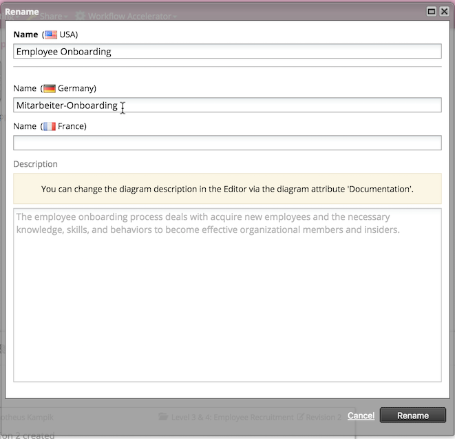 Translate the remaining diagram elements in the same way. After saving the diagram, it will be accessible in all languages of the workspace.