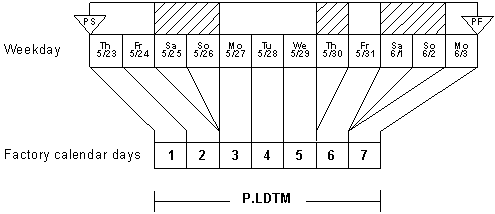 The following diagram demonstrates how weekdays are converted into factory calendar days. The planned lead time is calculated as 7 factory calendar days.