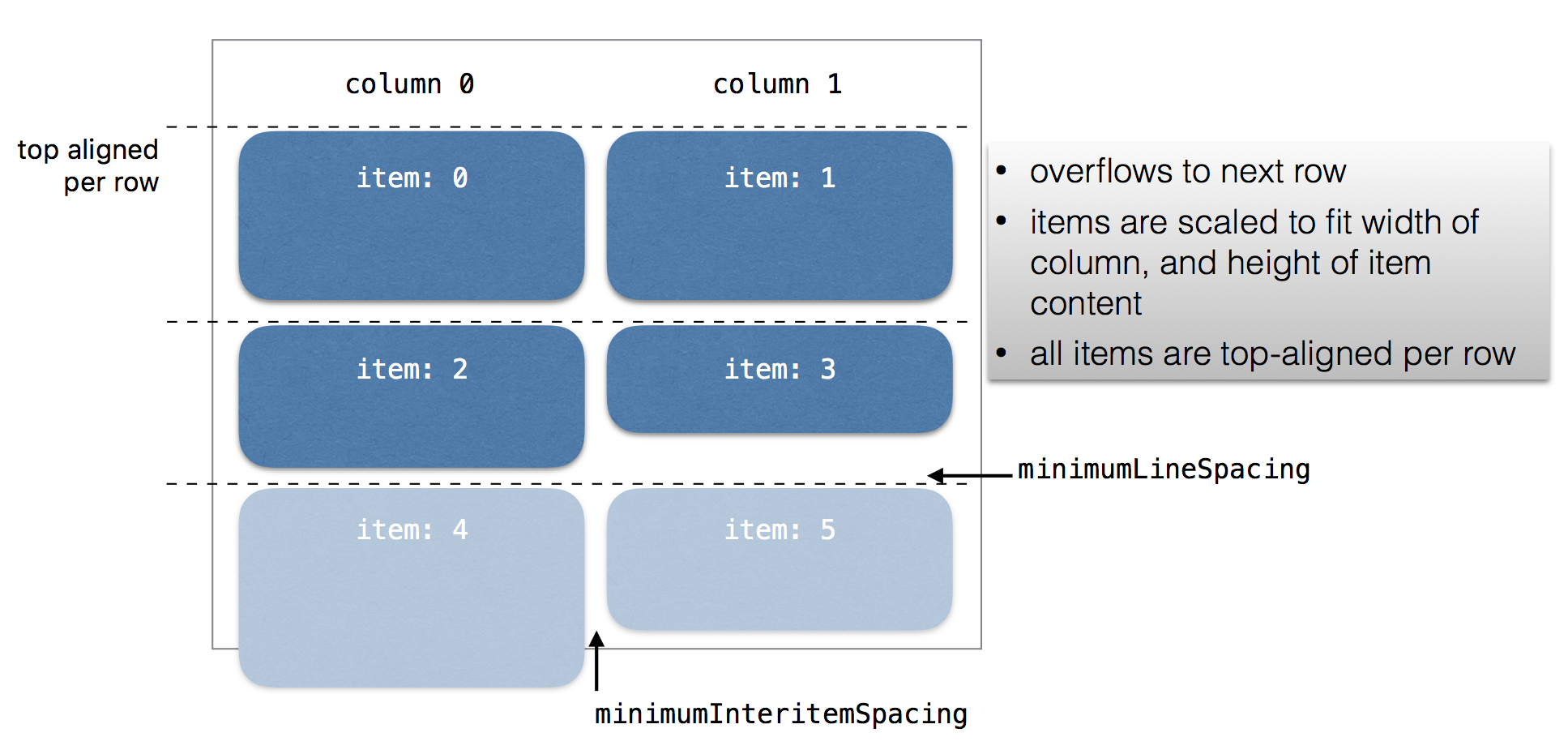 The autosizingColumnFlow resizes collection view cell items to lay them out according to a specified number of columns. All items per row are top-aligned, though the cell item height may vary, based upon the AutoLayout system’s height calculation for the cell. The leading/trailing edges of the first and last columns abut the respective margins of the content view.