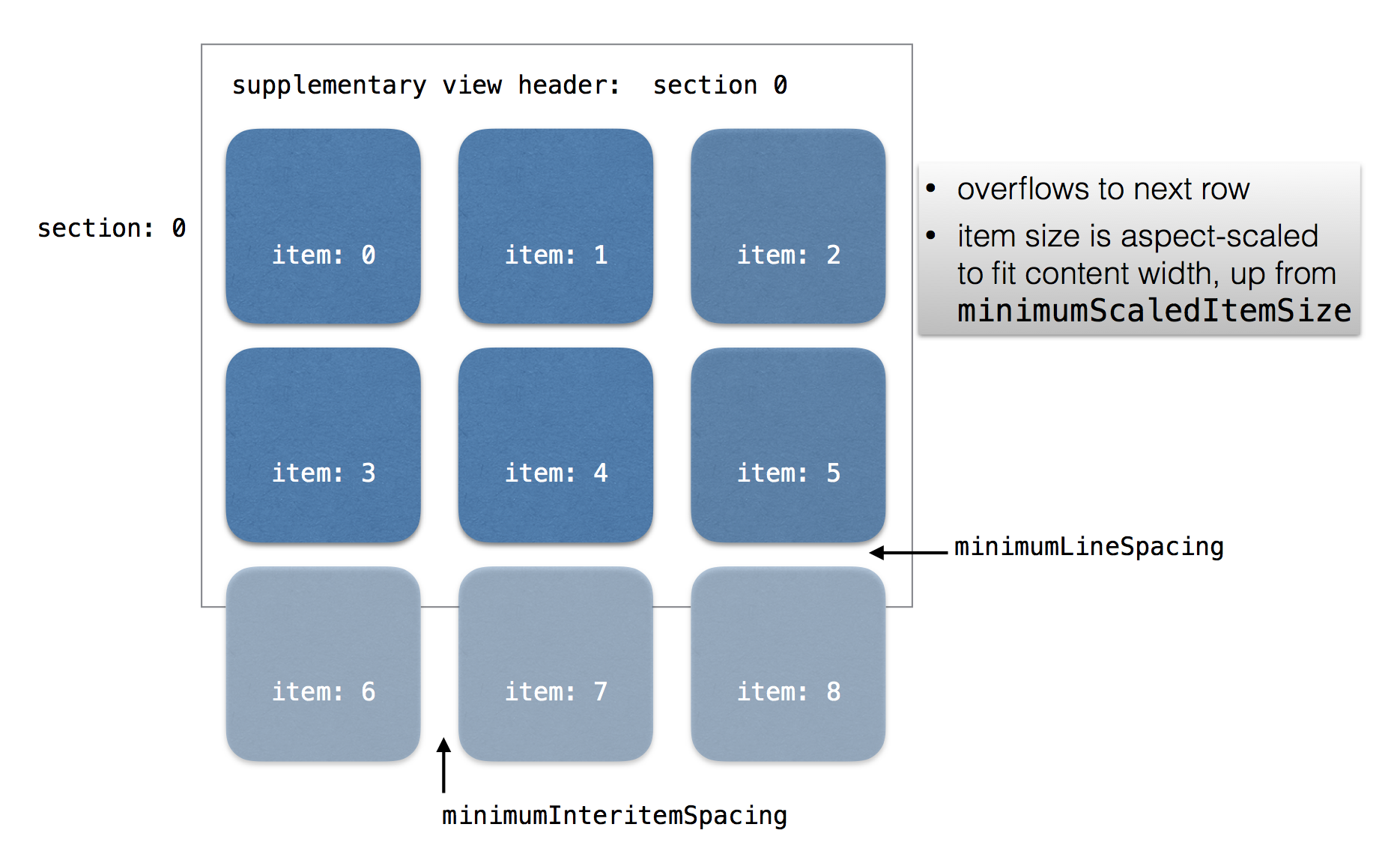 itemSize. - minimumScaledItemSize: Scale item upwards to fill the row based on the aspect ratio of