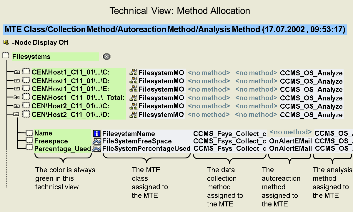 The individual monitoring tree elements (MTEs) of the Alert Monitor are assigned methods. These methods determine the data collection of the MTEs (data collection methods) and the possible reactions to an alert in the MTE (auto-reaction and analysis methods). You can find out the assigned methods by selecting an MTE and choosing Properties. This method is very time-consuming for obtaining an overview of the assigned methods for the MTEs of an entire monitor. The technical view Method Allocation exists as an alternative for this purpose. This view displays the method assignments for the MTEs of the entire monitor: