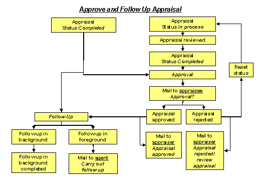 Once an appraiser has held and completed an appraisal, it can be sent to the appraisee for approval. The appraisee can display the appraisal, and opt to approve or reject it. If the appraisee decides to reject the appraisal, the appraiser can then review the appraisal. Once the appraisal has been approved, various follow-up activities can be performed.