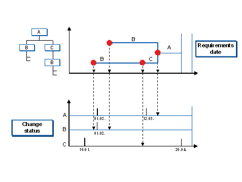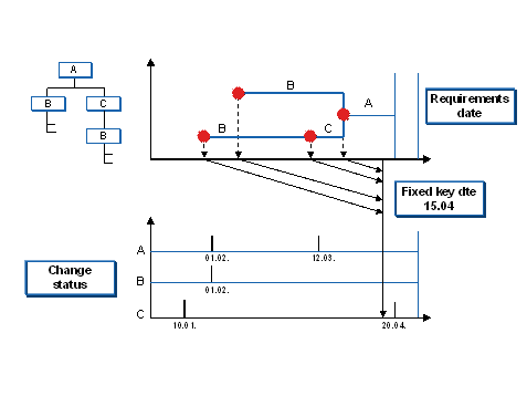 For multi-level BOM structures, larger time intervals may exist between the explosion dates of the individual assemblies. If BOMs (or alternative BOMs) have been changed in the meantime (for example, exchanging individual components due to new technical drawings, changed production techniques, due to parts to be discontinued etc.) a situation may exist whereby an assembly that is used repeatedly is produced with different BOM structures.