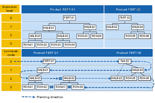 It determines the sequence in which the materials are planned. The system plans materials with the low-level code 0 first and then those with 1 and so on. The lower the low-level code is, the higher the number assigned to the level.