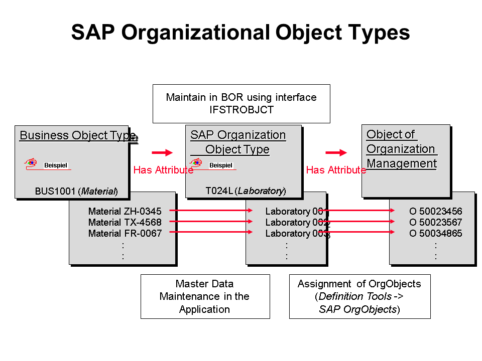An SAP organizational object type describes the organizational unit that is responsible for a business object type. This organizational unit consists of objects from Organizational Management. The business object type must have an attribute that refers to an SAP organizational object type.