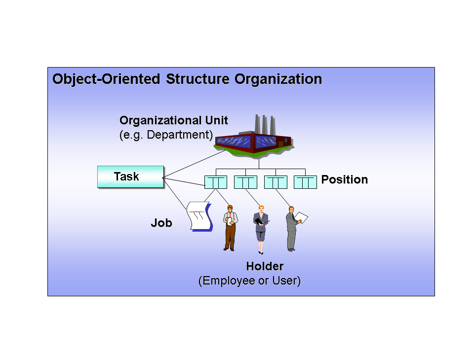 Other organizational units such as positions (sales administrator, for example) depict your enterprise's reporting structure. Objects such as jobs, tasks, and work centers are the building blocks of your organizational plan.