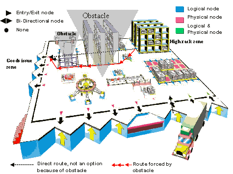 A resource is assigned a task to pick a handling unit from the high rack zone and bring it to the goods issue zone. The route pre-calculated by the system takes into account the racks which constitute obstacles between the source and destination zones. The route forced by the obstacles is calculated via the edges of these obstacles.