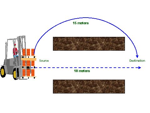The narrow aisle forklift can pass through the narrow aisle but the standard forklift has to make a detour. In this case, the route distance for the standard forklift will not be the calculated 10 meters but rather 15 meters. In this case, you would manually change the distance to 15 meters.