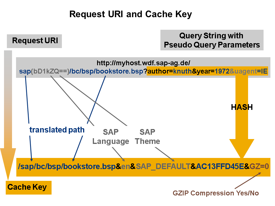 The URL path is translated, that is, the encoded information about the SAP language and SAP theme, separated by & symbols, is added after the ICF path. This is then followed by another & symbol and the query string with the pseudo query parameters. To restrict the length of this string, a hash process is used on the query string. The end of the cache key specifies whether the data is GZIP-compressed.