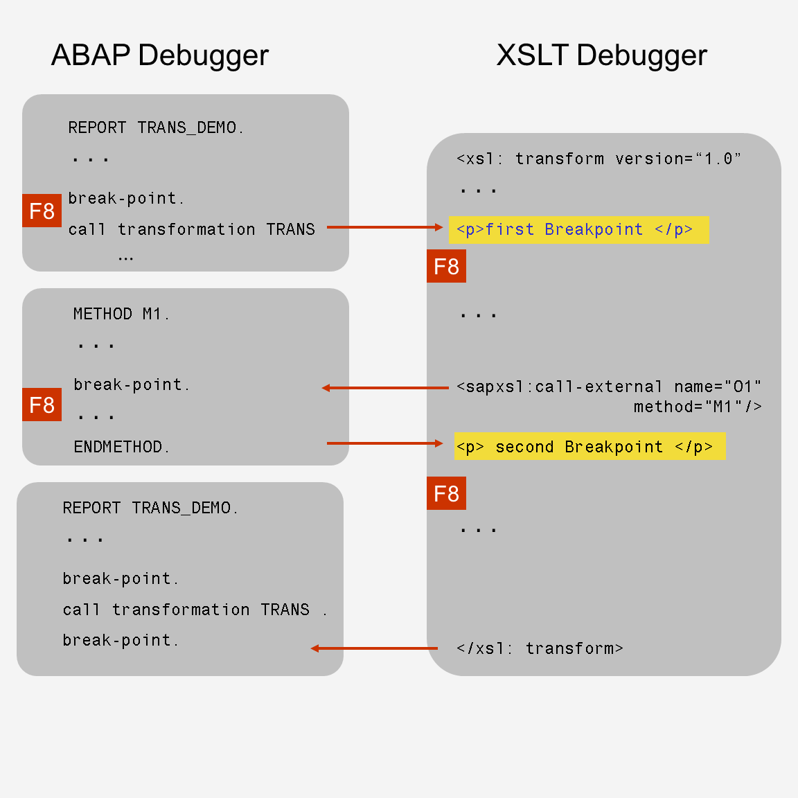 The following scenario demonstrates the flow of a typical debugging session based on the interaction between the ABAP Debugger and the XSLT Debugger.