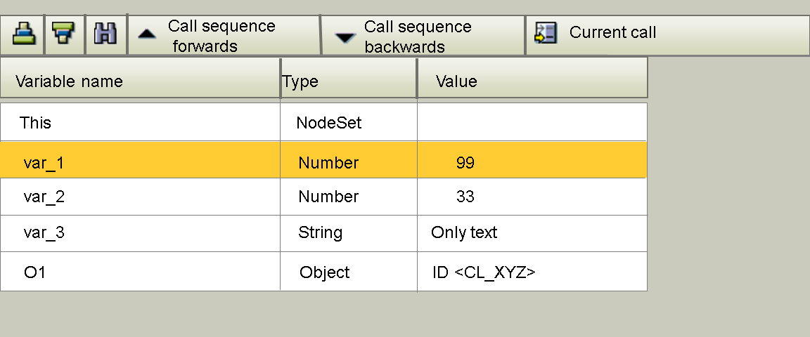 Using the variable view, you can display the values of the variables in the examined XSLT program in tabular form. You can switch between different call levels (for example, after calling <xsl: apply-templates...>) and output the valid variables in the corresponding context.