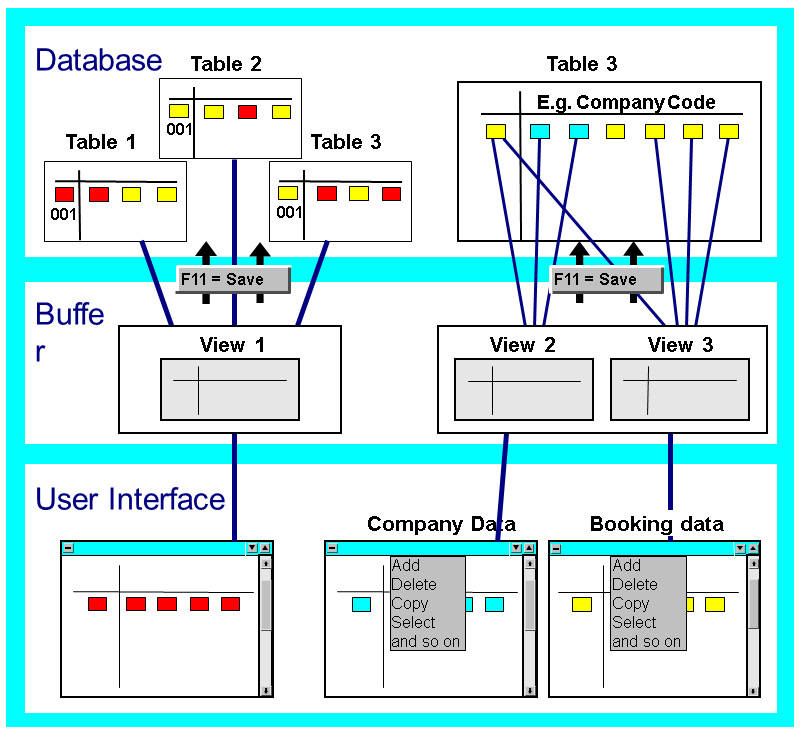 The field contents are maintained in the internal tables. So the database is not accessed after the maintenance of each view entry. The changes are transferred from the internal buffer to the database only when the user saves. This buffering makes the maintenance procedure transaction-oriented. This allows the user to discard changes before database access (user-controlled "Rollback"), and allows the calling main program to check the consistency of entries in the overall context.