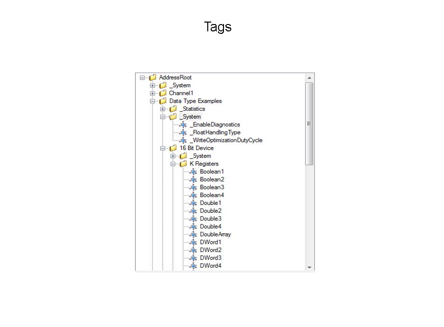 The following graphic shows the hierarchical structure of the data in a source system. The individual nodes (folder symbols) can represent the sensors of a plant, for example. The individual tags - such as Boolean 1, Boolean 2, and so on in the example here - are on the lowest level of the hierarchy.