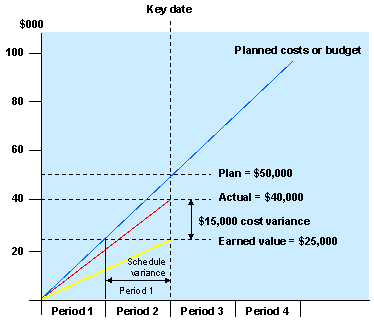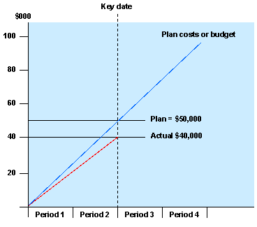 The graphic below illustrates the plan/actual comparison, showing a favorable project situation. The project costs seem likely to be less than the planned costs.