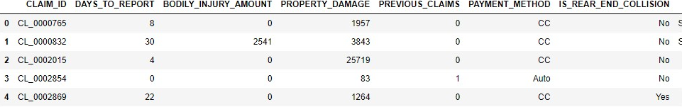 sql_cmd = 'SELECT * FROM "APL_SAMPLES"."AUTO_CLAIMS_FRAUD" ORDER BY CLAIM_ID'