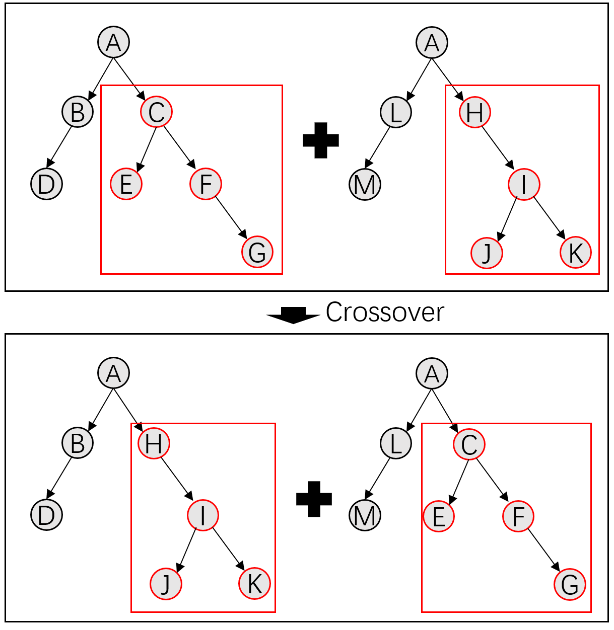 For two selected individuals, randomly exchange a pair of leaf nodes of equal type but different values, or a pair of child nodes with different structures.