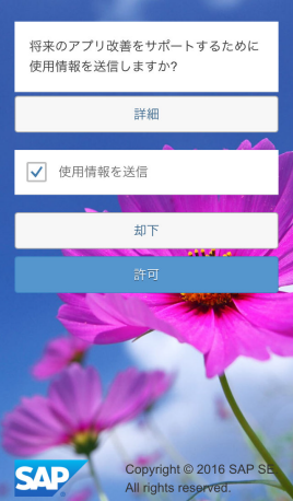 オプトイン画面が表示されると、諸条件をレビューしてから、許可を選択して同意するか、却下を選択して同意を却下します。データ収集設定は、SAP Fiori Client 設定画面から、いつでも許可または却下に変更することができます。データ収集を有効化する、または無効化する方法の詳細については、設定画面を参照してください。