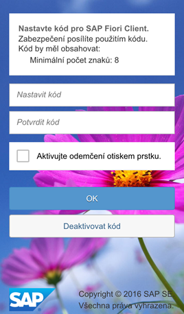 Pokud je aktivní autentizace otiskem prstu a chcete odemknout SAP Fiori, budete vyzváni, abyste naskenovali otisk prstu, který jste potvrdili při první aktivaci této funkce. Pokud se autentizace otiskem prstu nezdaří, budete vyzváni, abyste zadali svůj kód. Chcete-li deaktivovat autentizaci otiskem prstu, zrušte zaškrtnutí políčka Aktivujte odemčení otiskem prstu.