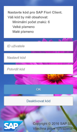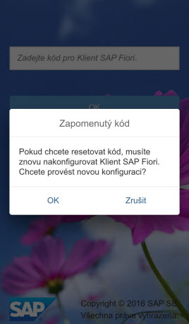 Pokud zapomenete kód k aplikaci, můžete klepnout na tlačítko Zapomenutý kód a kód vyresetovat. Vyresetujete tak konfiguraci aplikace a uživatele. K SAP Fiori nebudete moci přistupovat prostřednictvím aplikace SAP Fiori Client, dokud ji znovu nenakonfigurujete.