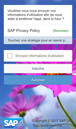 Lorsque l’écran opt-in apparaît, touchez "Stratégie de confidentialité SAP" pour réviser les conditions commerciales, puis cliquez sur Autoriser pour donner votre consentement ou sur Refuser pour refuser le consentement. Il peut y avoir des stratégies de confidentialité supplémentaires en fonction des besoins de votre entreprise.