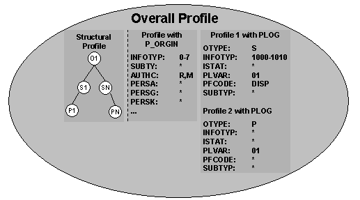 The structural profile determines which object in the organizational structure the user has access to. The general profile determines which object data (infotype, subtype) and which access mode (Read, Write, ...) the user has for those objects.