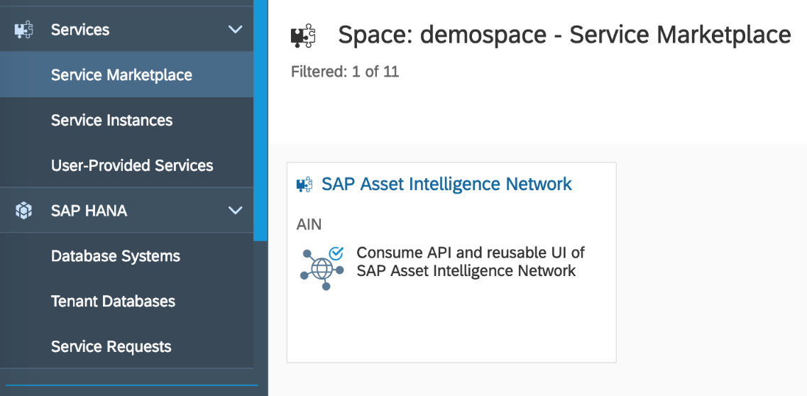 - Enter your space and click ‘Service Marketplace’ where you will find the service tile for Asset Intelligence Network.
