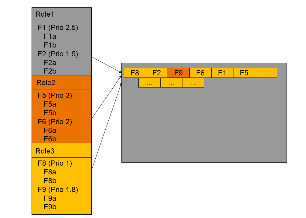 You can decide that entry points F1 and F2 of role 1 should appear in the fifth and second location; entry points F5 and F6 of role 2 at the sixth and fourth location, and; entry points F8 and F9 of role 3 at the first and third location of top-level navigation. The following figure shows how you should define the priorities for the entry points so that they appear in the desired order in your portal.