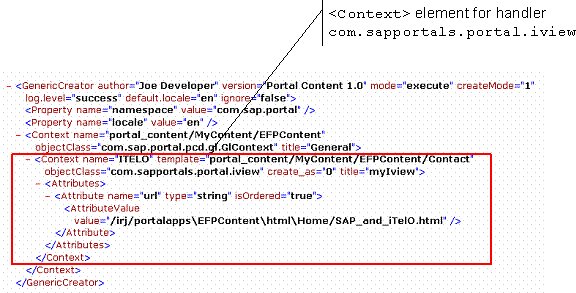 The following sample XML file defines a folder called General , which contains an iView called myIview . The XML for the iView is marked.