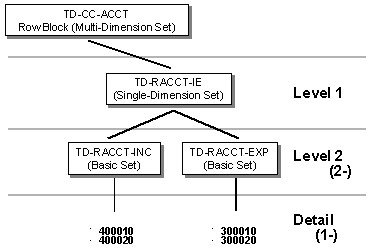 Level 2 (2-) includes the basic sets TD-RACCT-INC and TD-RACCT-EXP. The sets are ordered in the hierarchy in the same order as they appear in the single-dimension set TD-RACCT-IE. Both sets have the characteristic