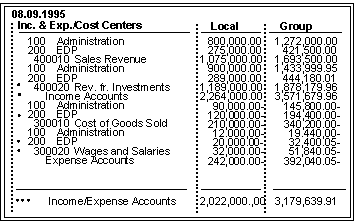 The report lists totals for individual income and expense accounts according to cost centers. Accounts appear within the subheading Cost Center because the single-dimension set TD-RACCT-IE appears second in the multi-dimension set. (In our example, the totals are output at the end. If you change the layout, however, you can have the totals output at the top of the report.) For more information, see Defining Report Layouts .