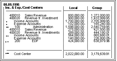If a basic set line has an interval of account numbers 1000020 to 1000050, the system prints the amounts for all the account numbers from 1000020 to 100050, if data has been posted for these accounts. If you set the suppression indicator in the basic set for this line, the system prints only the total for the account numbers 1000020 to 1000050 instead of the individual amounts.